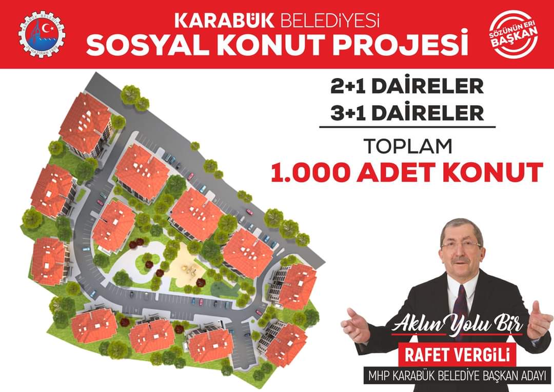 Karabük Belediye Başkanı ve Milliyetçi Hareket Partisi Karabük Belediye Başkan Adayı Rafet Vergili, 4. dönem projesinden 1. önemli proje olarak 2+1 ve 3+1 daireli 1.000 adet konut yapılacağını ve asgari ücret maaş alanların, emekli ve ihtiyaç sahibi ailelerin ev sahibi yapılacağını açıkladı.