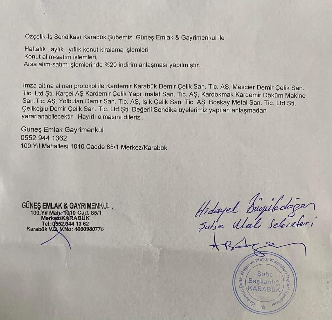 Aktif çevresi ve güvenilir ticari ilişkileri ile Karabük’te sevilen Büşra GÖKTEPE Özçelik İş Sendikası üyeleri ile arsa alım satım işlemlerinde %20 indirim anlaşması yaptı.