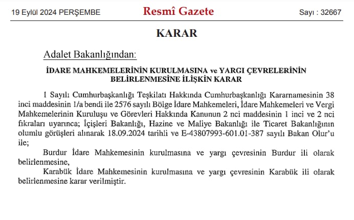 Burdur ve Karabük’te idare mahkemesi kurulması kararı Resmi Gazete’de Yayınlandı. Adalet Bakanlığının, İdare Mahkemesinin Kurulmasına ve Yargı Çevresinin Belirlenmesine İlişkin Kararı, bugünkü Resmi Gazete’de yayımlandı. Bu kapsamda Karabük ve Burdur..
