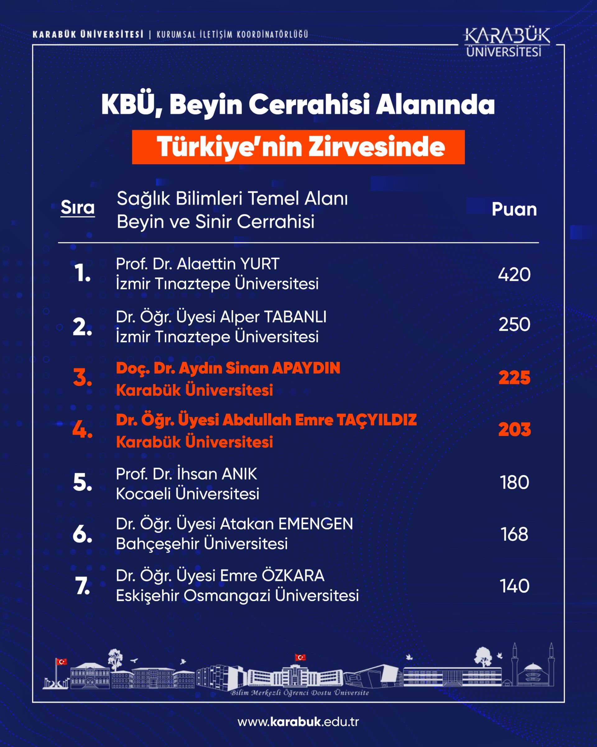 Karabük Üniversitesi Beyin ve Sinir Cerrahisi Anabilim Dalı, bu iki ismin başarısıyla birlikte Türkiye’de beyin cerrahisi alanında akademik üretim bakımından örnek gösterilecek bir pozisyona ulaştı. Aynı anabilim dalından iki öğretim üyesinin ülke genelinde ilk beş içerisinde yer alması, hem fakülte hem de üniversite düzeyinde sürdürülen akademik vizyonun bir sonucu olarak öne çıkıyor.